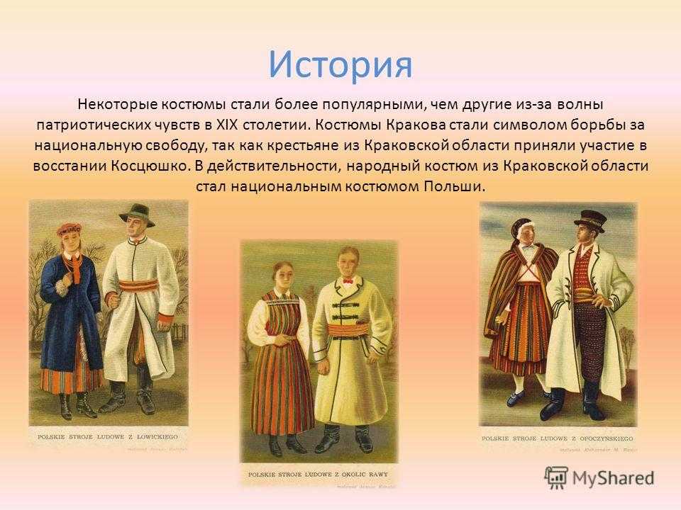 История Некоторые костюмы стали более популярными, чем другие из-за волны патриотических чувств в XIX столетии. Костюмы Кракова стали символом борьбы за национальную свободу, так как крестьяне из Краковской области приняли участие в восстании Косцюшко. В действительности, народный костюм из Краковской области стал национальным костюмом Польши.