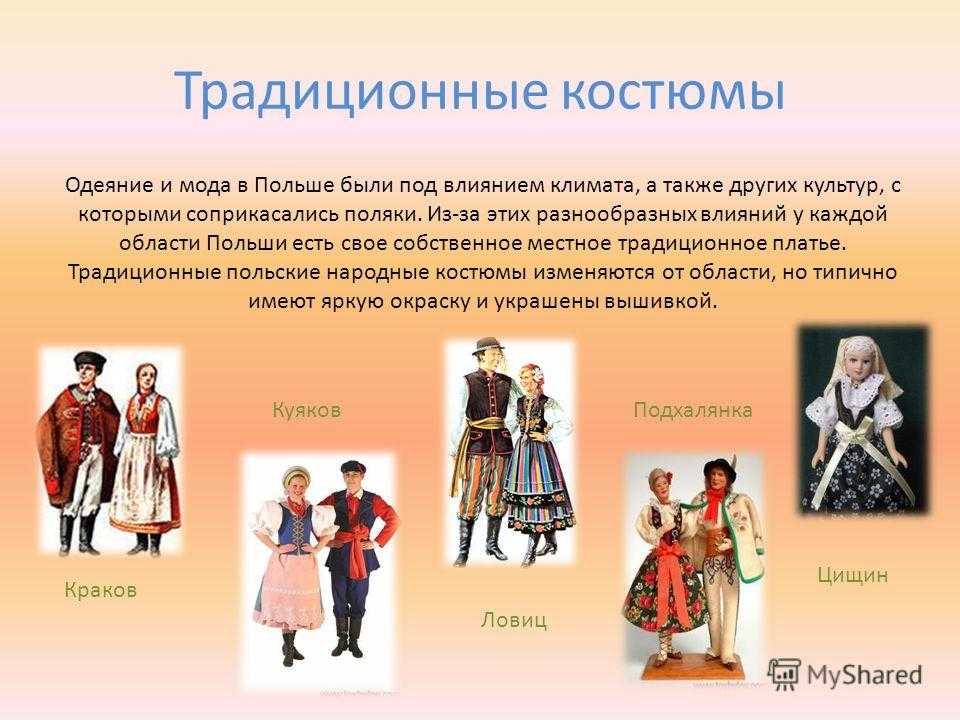 Традиционные костюмы Одеяние и мода в Польше были под влиянием климата, а также других культур, с которыми соприкасались поляки. Из-за этих разнообразных влияний у каждой области Польши есть свое собственное местное традиционное платье. Традиционные польские народные костюмы изменяются от области, но типично имеют яркую окраску и украшены вышивкой. Краков Куяков Цищин Ловиц Подхалянка