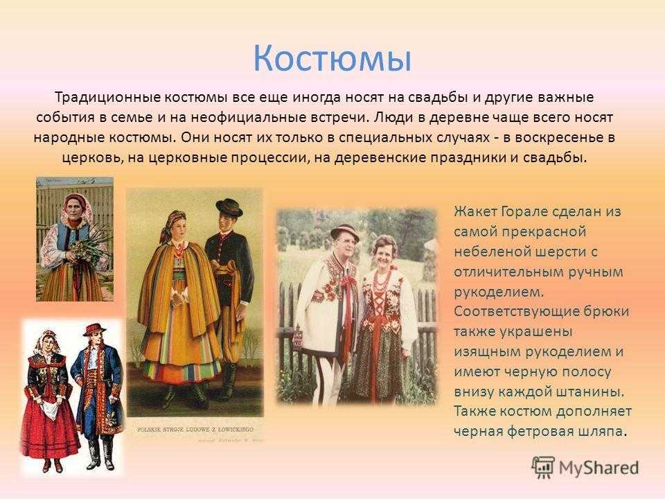 - Если углубиться в историю, то ни для кого не станет секретом, что в свое время на Польшу оказывали влияние совершенно разные культуры. Это сказалось на многих аспектах данной страны, в том числе и на национальных костюмах. По этой причине национальную польскую одежду можно назвать поистине уникальной и неповторимой, ведь в ней гармонично сочетаются мотивы России, Литвы, Австрии, Румынии и ряда других стран.