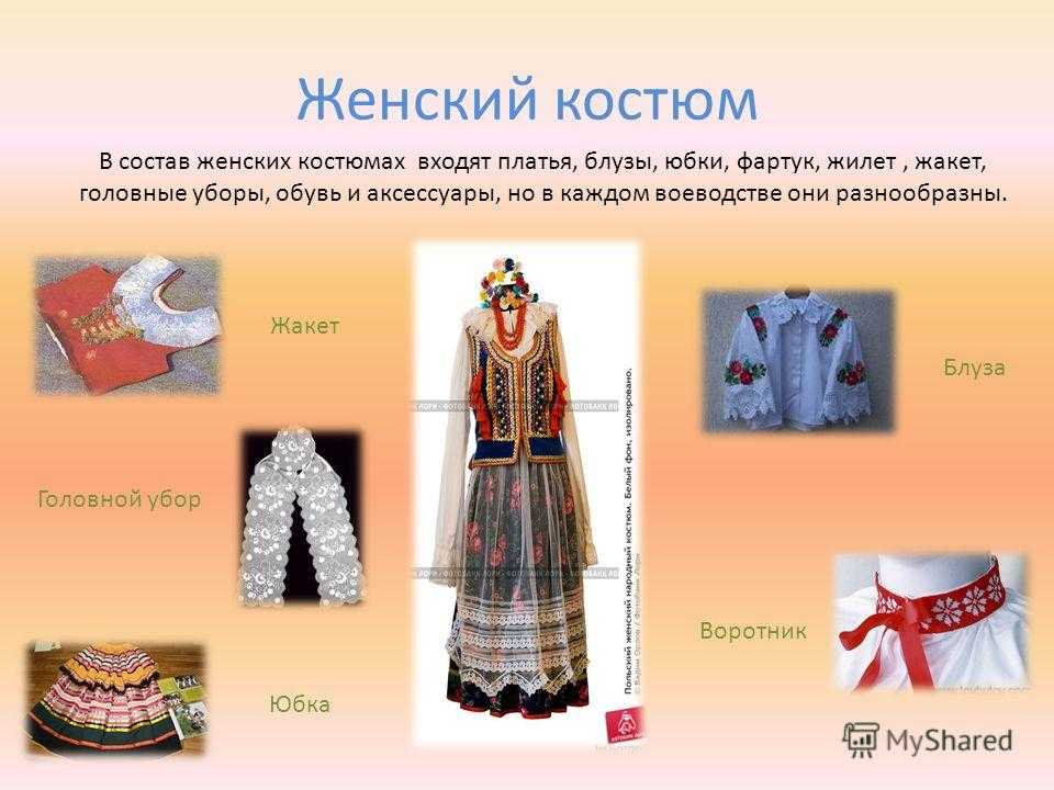 Женский костюм В состав женских костюмах входят платья, блузы, юбки, фартук, жилет, жакет, головные уборы, обувь и аксессуары, но в каждом воеводстве они разнообразны. Головной убор Юбка Блуза Жакет Воротник