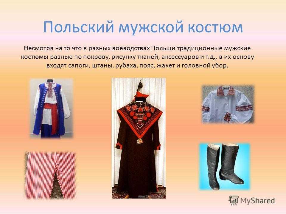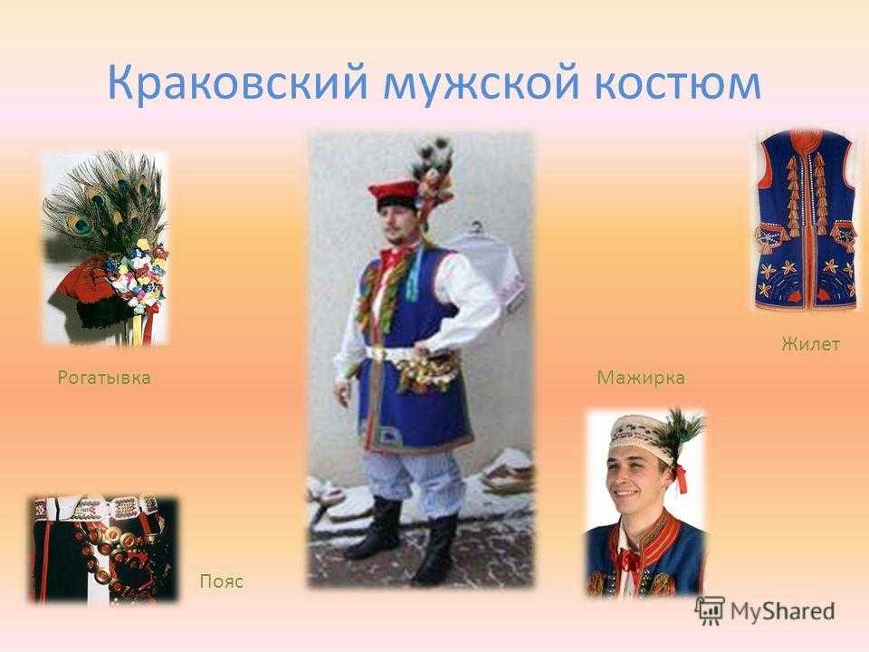 Польский мужской костюм Несмотря на то что в разных воеводствах Польши традиционные мужские костюмы разные по покрову, рисунку тканей, аксессуаров и т.д., в их основу входят сапоги, штаны, рубаха, пояс, жакет и головной убор.