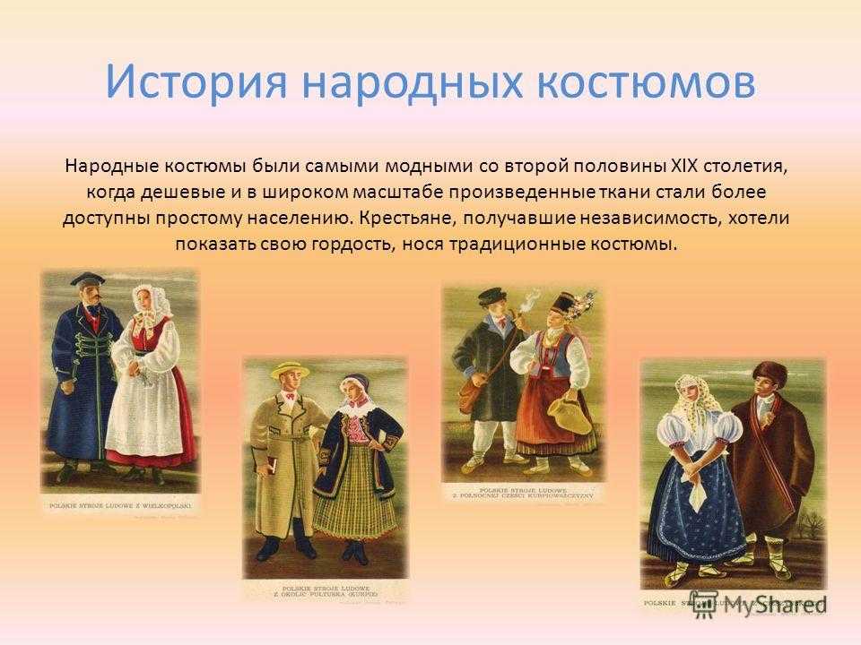 История народных костюмов Народные костюмы были самыми модными со второй половины XIX столетия, когда дешевые и в широком масштабе произведенные ткани стали более доступны простому населению. Крестьяне, получавшие независимость, хотели показать свою гордость, нося традиционные костюмы.