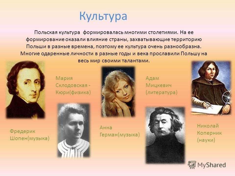 Культура Польская культура формировалась многими столетиями. На ее формирование оказали влияние страны, захватывающие территорию Польши в разные времена, поэтому ее культура очень разнообразна. Многие одаренные личности в разные годы и века прославили Польшу на весь мир своими талантами. Фредерик Шопен(музыка) Мария Склодовская — Кюри(физика) Анна Герман(музыка) Адам Мицкевич (литература) Николай Коперник (науки)