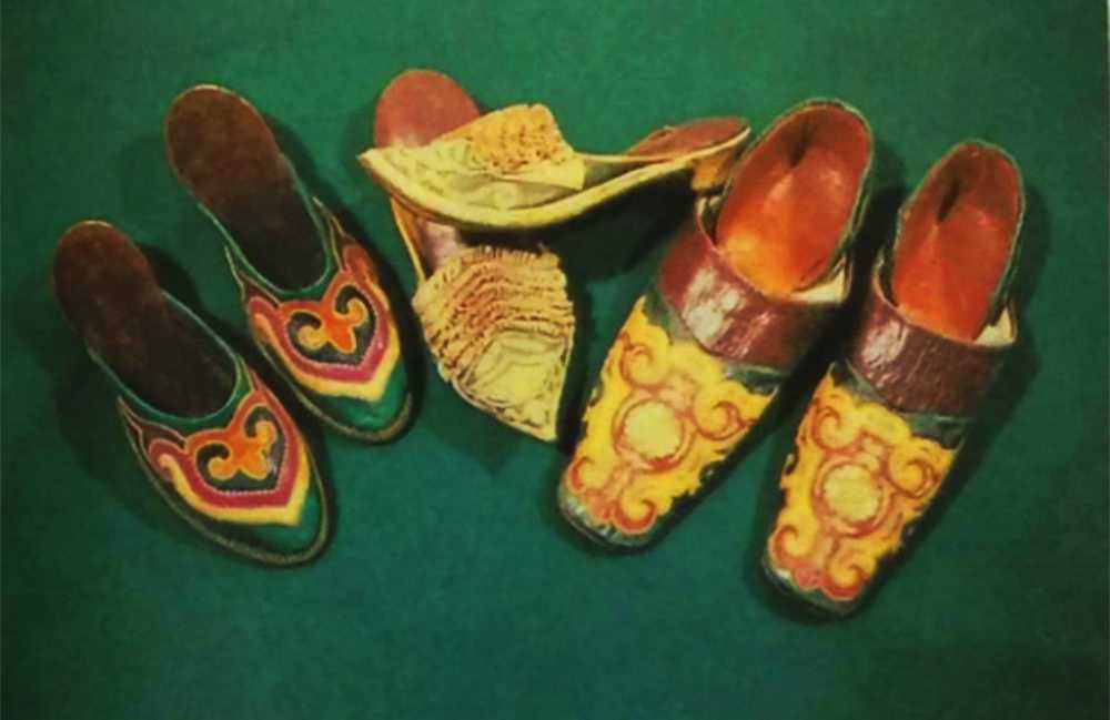 - высокие сапожки из мягкой кожи (юфти, хрома или сафьяна) с мягкой подошвой, представлена в двух вариантах – однотонные черные и узорные ичиги, выполненные в технике кожаной мозаики из разноцветных кусочков кожи, скрепленных отделочными шелковыми нитями;