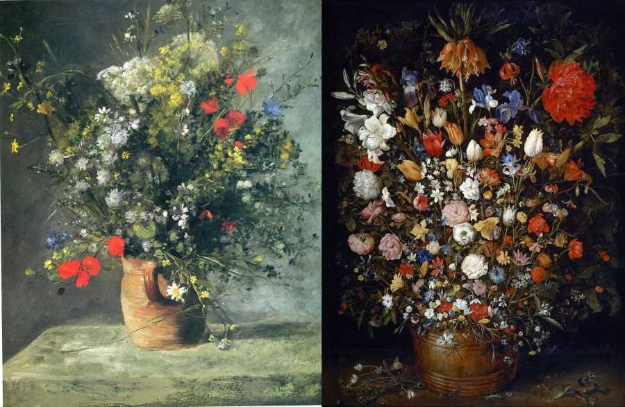 Слева: Пьер Огюст Ренуар. Букет. 1866. Национальная галерея Вашингтона. Огюст-Ренуар.рф. Справа: Ян Брейгель Старший. Букет. 1606-1608. Старая Пинакотека в Мюнхене. Wikimedia Commons.