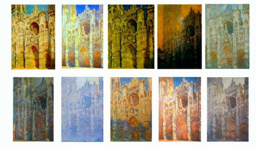 Замечательный пример — серия соборов Моне. Мы видим, что рисунок остается практически неизменным, художник исследует цвет.