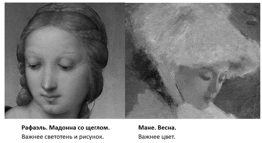 Еще одно сравнение. Это работа Мане, противоположная по задачам. Посмотрите, если из нее убрать цвет, ничего не останется. У Мане цвет — основа. Тогда как Мадонна Рафаэля в черно-белом варианте производит вполне целостное впечатление. Потому что основа этого произведения — тон.