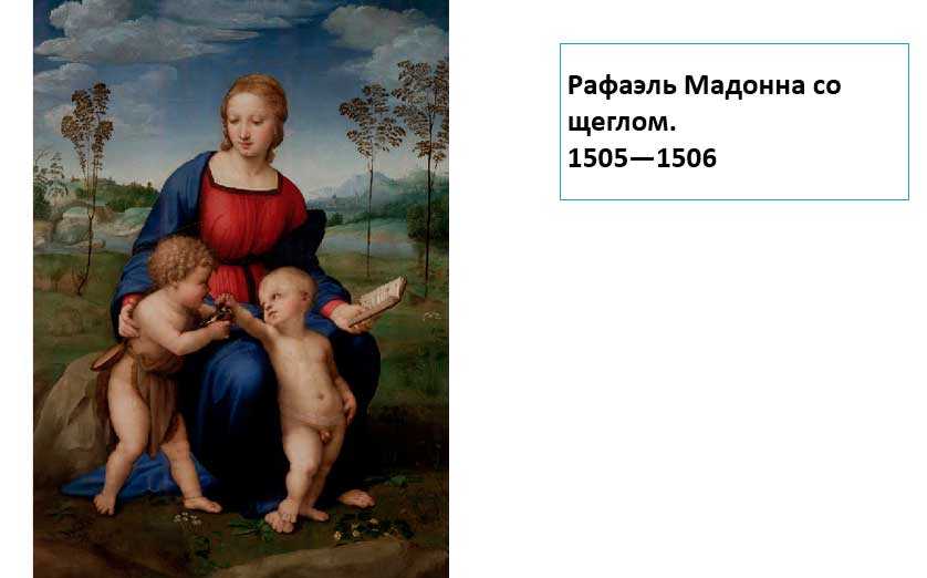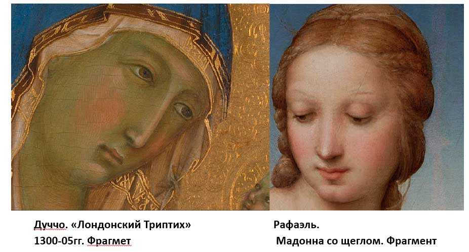 Давайте сравним изображения Мадонны Дуччо и Рафаэля. Посмотрите на лицо рафаэлевской Мадонны — насколько верно передан цвет кожи молодой девушки, не конкретной подружки художника с соседней улицы, а такой, как мы представляем в мечтах, идеальной. В работе Дуччо таких задач нет и близко.