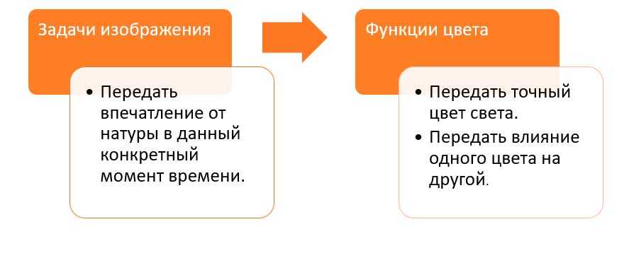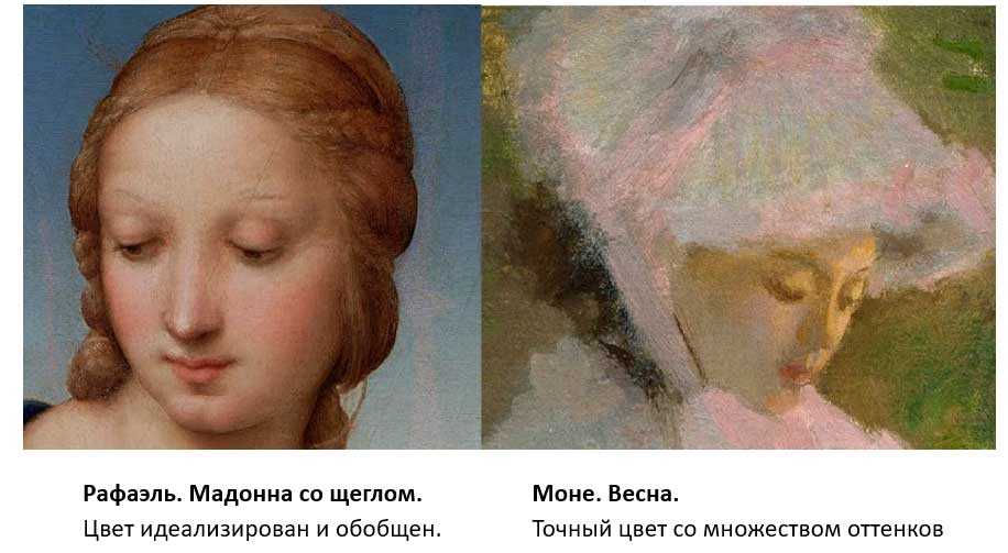 Теперь они стремятся точно передать не только собственный цвет предмета, но и точный цвет света и влияние одного цвета на другой. То есть максимально точно передать колорит, которые они в данный момент видят в натуре (живописцы называют это состоянием).
