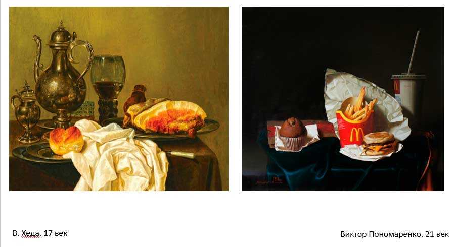 Практически прямое цитирование — творчество В. Пономаренко. Нарочитые аллюзии на натюрморты “малых голландцев” в сочетании с подбором предметов, отсылающих к социальным проблемам современного общества, придают его работам глубину и оригинальное звучание.