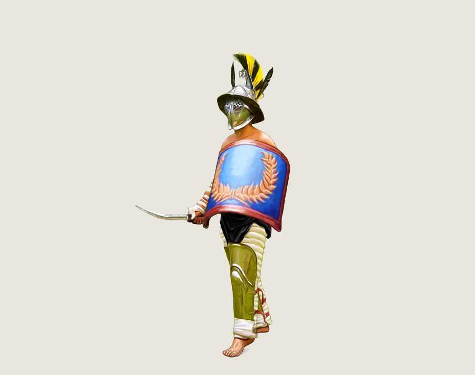 Чисто теоретически его существование можно объяснить. Известно, что римляне привозили из покоренных стран много пленных, которых заставляли сражаться между собой на арене. Много классов гладиаторов произошло от таких вот бедолаг, они и назывались-то по национальному признаку – фракиец, галл…