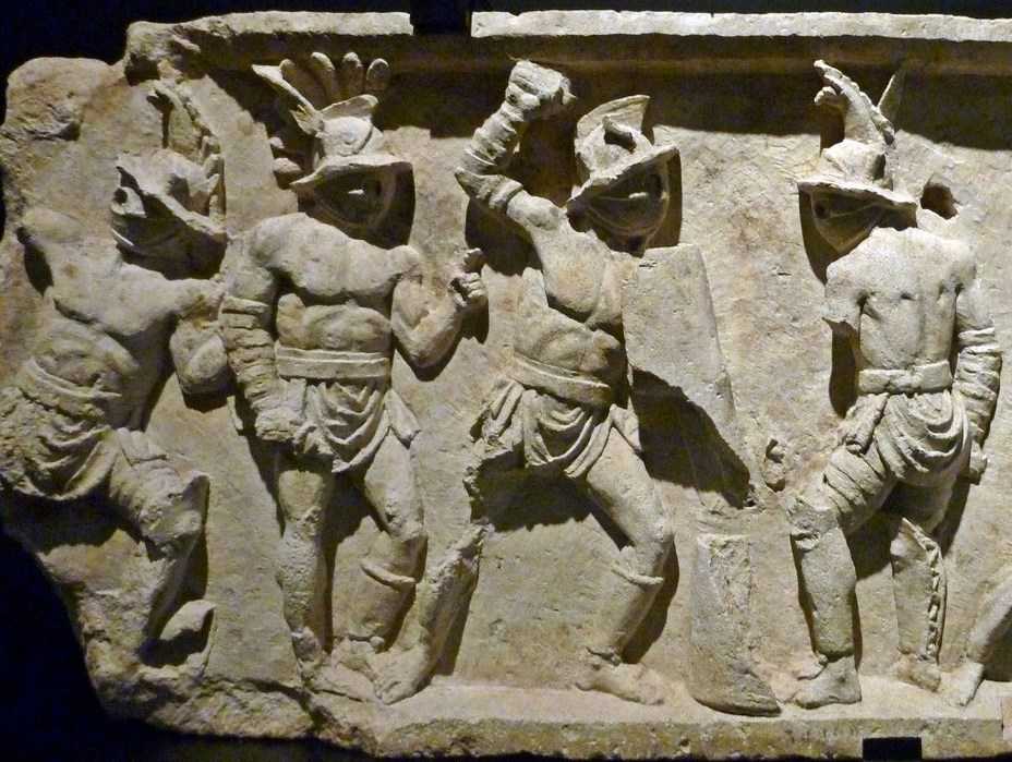 Часть рельефа с погребального склепа Гая Лузия Сторакса (25 – 50 годы н.э.) с изображением поединка гладиаторов. В центре изображены два мурмиллона, по сторонам — двое фракийцев