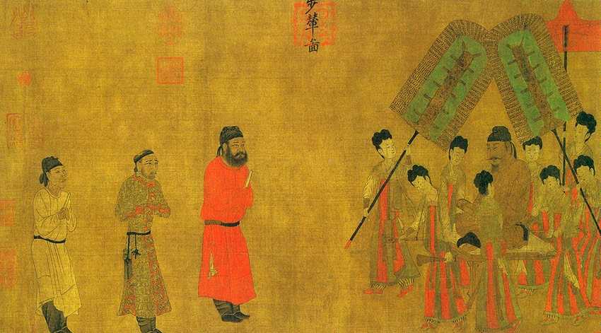 Популярная тема придворных художников династии Тан – иностранные послы, приносящие дань уважения императору. Дипломатические миссии и сопутствующие им роскошные подношения оставались важным средством международных отношений. Ещё в первые десятилетия правления династия расширила контроль: