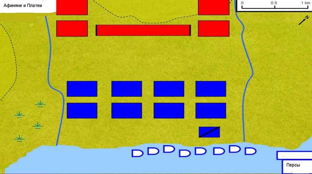 - Пока персы отходили, Мильтиад атаковал вражеский арьергард *. Главные силы персов – кавалерия – не участвовали в бою, так как уже были погружены на корабль. В арьергарде сражались только пешие лучники, а со стороны греков была фаланга гоплитов.