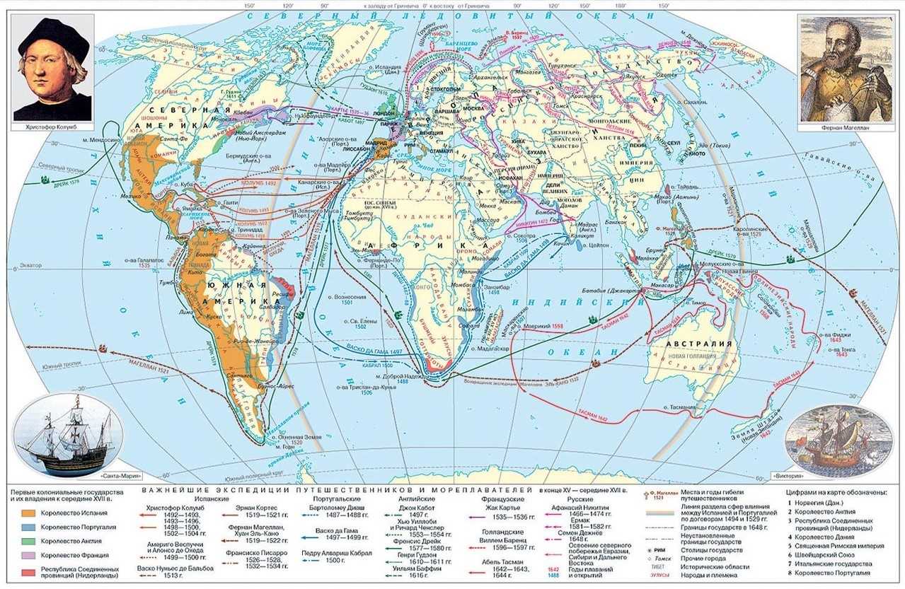 Великие географические открытия начались с поиска кратчайшего пути в Индию. Основные открытия совершали представители Южной Европы — испанцы и португальцы. Среди знаменитых путешественников отметим Х. Колумба, Васко де Гамма, Ф. Магеллан, А. Веспуччи, Б. Диаш. В результате их путешествий были открыты Америка (как Северная, так и Южная), ранее неизвестные части Азии, Африки, Австралии. Открывалось множество возможностей для развития торговли со всем миром.