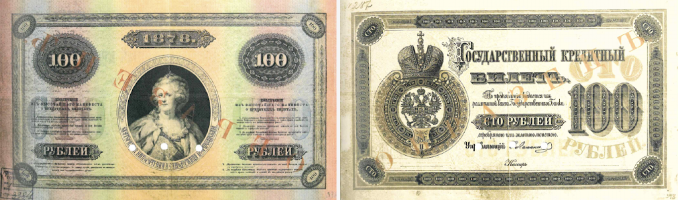 Сторублевая купюра снова стала самым крупным номиналом и оставалась таковым до конца 19 века. В конце века за 150 рублей можно было купить средний крестьянский дом с надворными постройками в Нижегородской губернии. Поэтому купюра и стала самой защищенной от подделки и замысловато оформленной. Для этого впервые применили цветную радужную печать — ирис. Она и дала народное прозвище банкноте — «радуга».