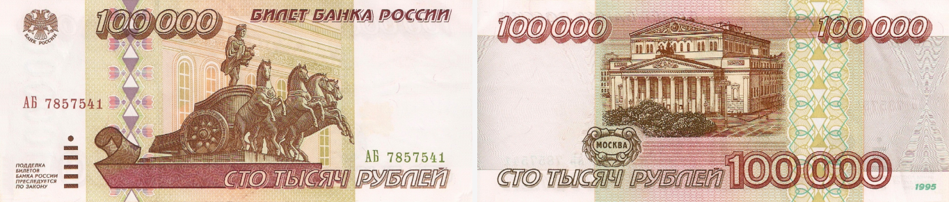 В 1998 году в стране была проведена деноминация рубля в масштабе 1000:1. С банкнот 100 000 рублей образца 1995 года исчезли три ноля. Оформление и технология их выпуска изменились незначительно, потому что все банкноты этой серии изначально спроектировали так, чтобы изменить обозначение номинала, не прибегая к перекомпоновке купюр.