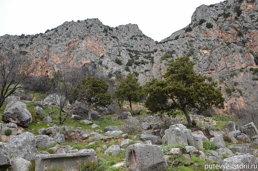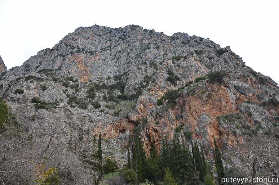 Эта археологическая зона самая большая и самая эффектная. Она состоит из 3-х террас, обрамлённых сверху исполинской скальной стеной, представляющей собой обрыв горы Парнас.