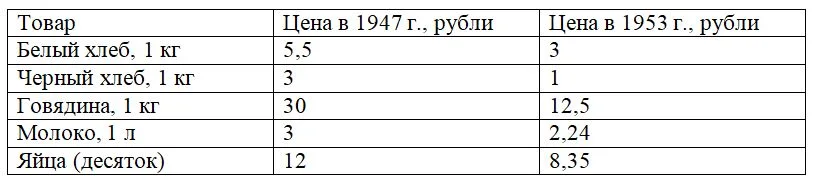 Одновременно с проведением денежной реформы была отменена и карточная система. При этом были снижены цены на многие товары – хлеб, макароны, масло и т. д. В дальнейшие годы курс на снижение цен был продолжен.