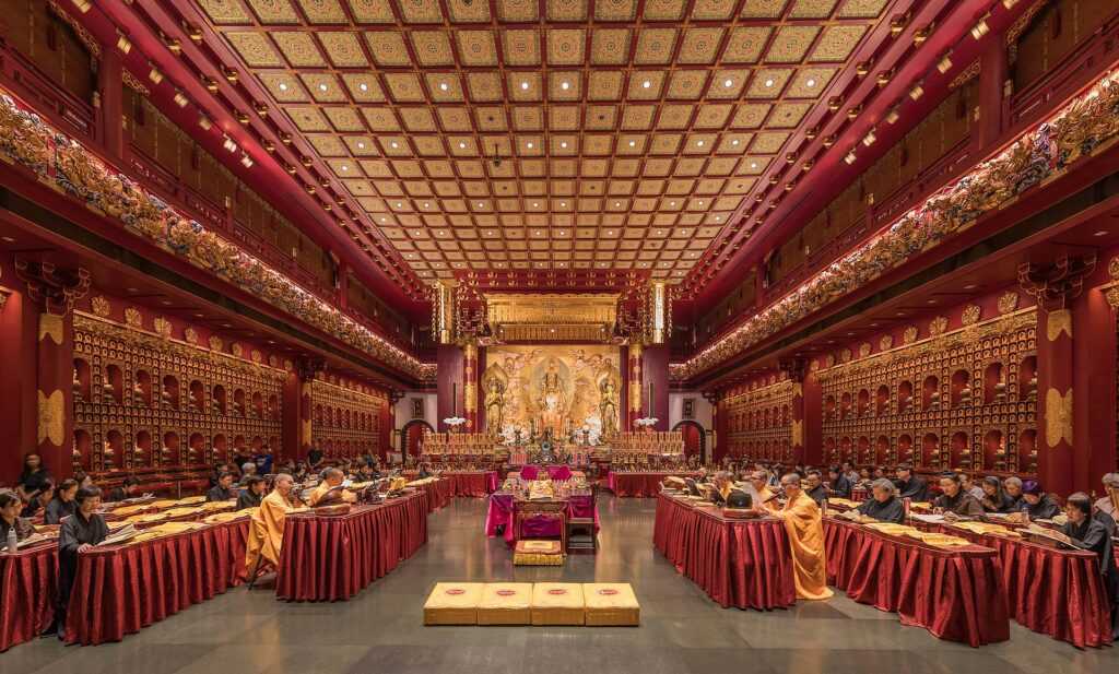 Буддийские монахи и монахини молятся в храме реликвии Зуба Будды в Сингапуре