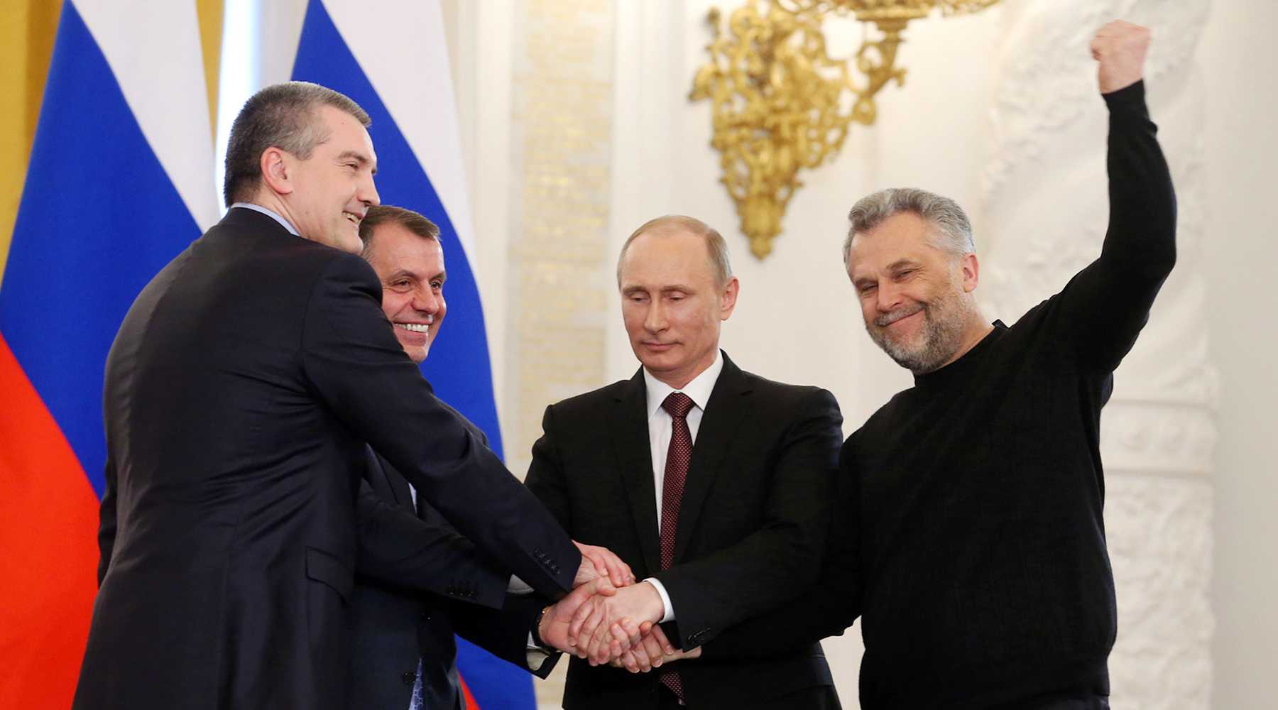 - Президент РФ Владимир Путин в Кремле во время церемонии подписания договора между Российской Федерацией и Республикой Крым. Слева направо: премьер-министр Республики Крым Сергей Аксёнов, председатель Госсовета Республики Крым Владимир Константинов, Владимир Путин, глава Севастополя Алексей Чалый