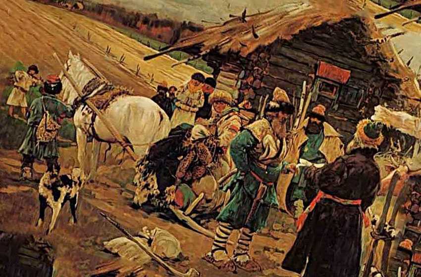 Крестьяне уходят от помещика в Юрьев день. Художник Иванов С. В.