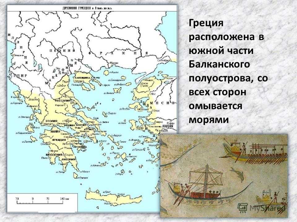 Расположенная в южной части Европы, на территории с небольшой плодородной и преимущественно горной почвой, Древняя Греция располагалась на Балканском полуострове, простираясь до островов Эгейского моря (островная Греция) и побережья Малой Азии (азиатская Греция).,