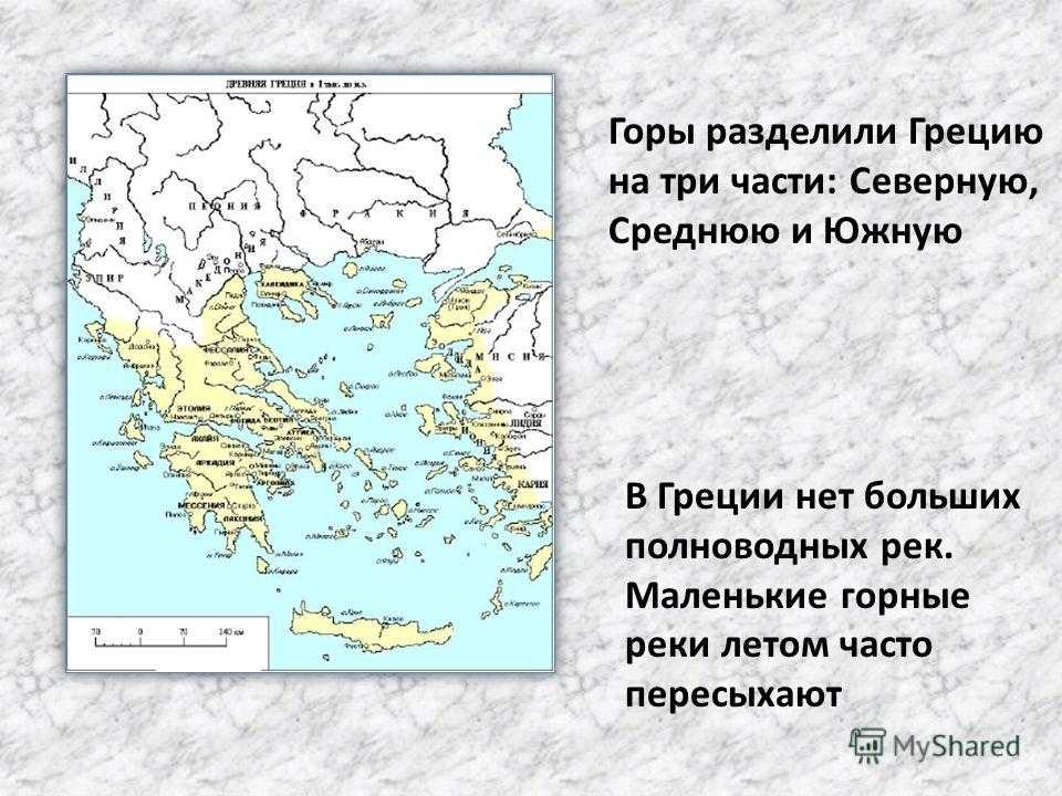 Горы разделили Грецию на три части: Северную, Среднюю и Южную В Греции нет больших полноводных рек. Маленькие горные реки летом часто пересыхают