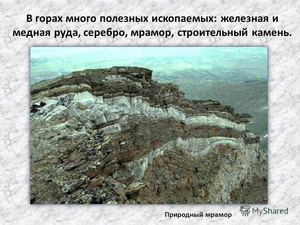 В горах много полезных ископаемых: железная и медная руда, серебро, мрамор, строительный камень. Природный мрамор