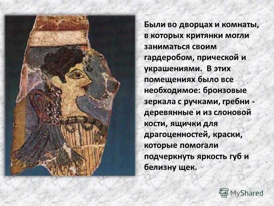 Были во дворцах и комнаты, в которых критянки могли заниматься своим гардеробом, прической и украшениями. В этих помещениях было все необходимое: бронзовые зеркала с ручками, гребни — деревянные и из слоновой кости, ящички для драгоценностей, краски, которые помогали подчеркнуть яркость губ и белизну щек.