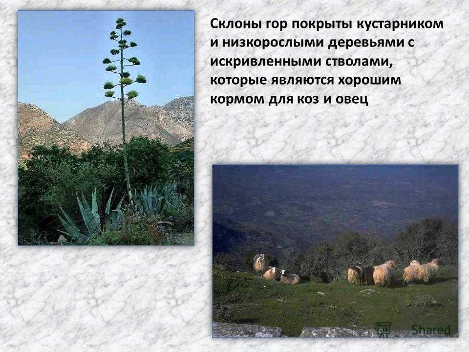 Склоны гор покрыты кустарником и низкорослыми деревьями с искривленными стволами, которые являются хорошим кормом для коз и овец