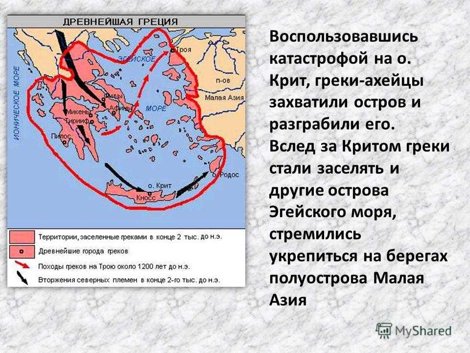 Воспользовавшись катастрофой на о. Крит, греки-ахейцы захватили остров и разграбили его. Вслед за Критом греки стали заселять и другие острова Эгейского моря, стремились укрепиться на берегах полуострова Малая Азия
