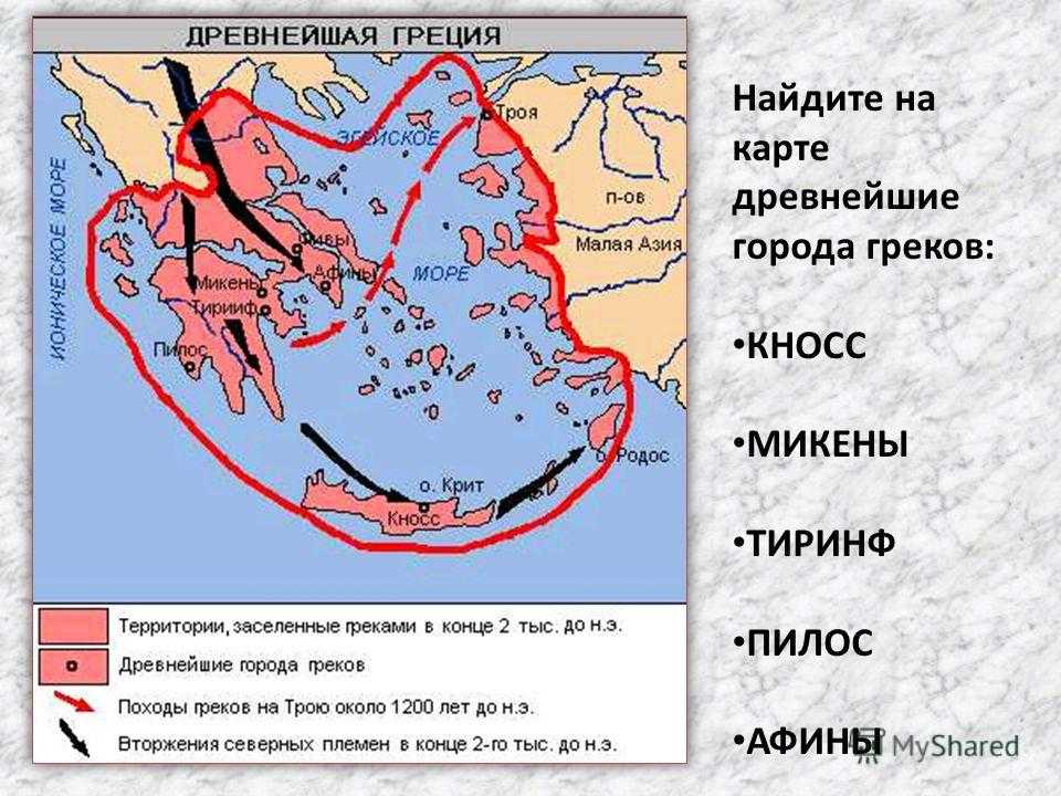 Найдите на карте древнейшие города греков: КНОСС МИКЕНЫ ТИРИНФ ПИЛОС АФИНЫ