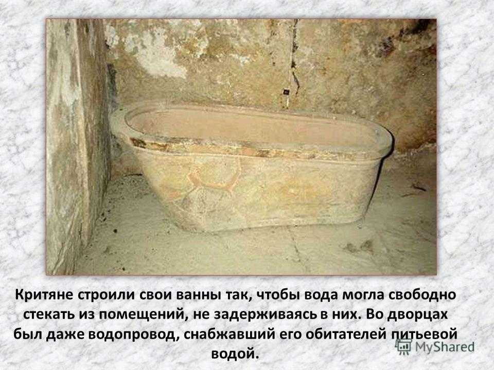 Критяне строили свои ванны так, чтобы вода могла свободно стекать из помещений, не задерживаясь в них. Во дворцах был даже водопровод, снабжавший его обитателей питьевой водой.
