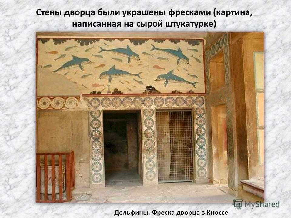 Стены дворца были украшены фресками (картина, написанная на сырой штукатурке) Дельфины. Фреска дворца в Кноссе