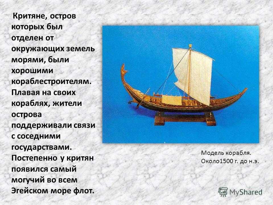 Критяне, остров которых был отделен от окружающих земель морями, были хорошими кораблестроителям. Плавая на своих кораблях, жители острова поддерживали связи с соседними государствами. Постепенно у критян появился самый могучий во всем Эгейском море флот. Модель корабля. Около 1500 г. до н.э.