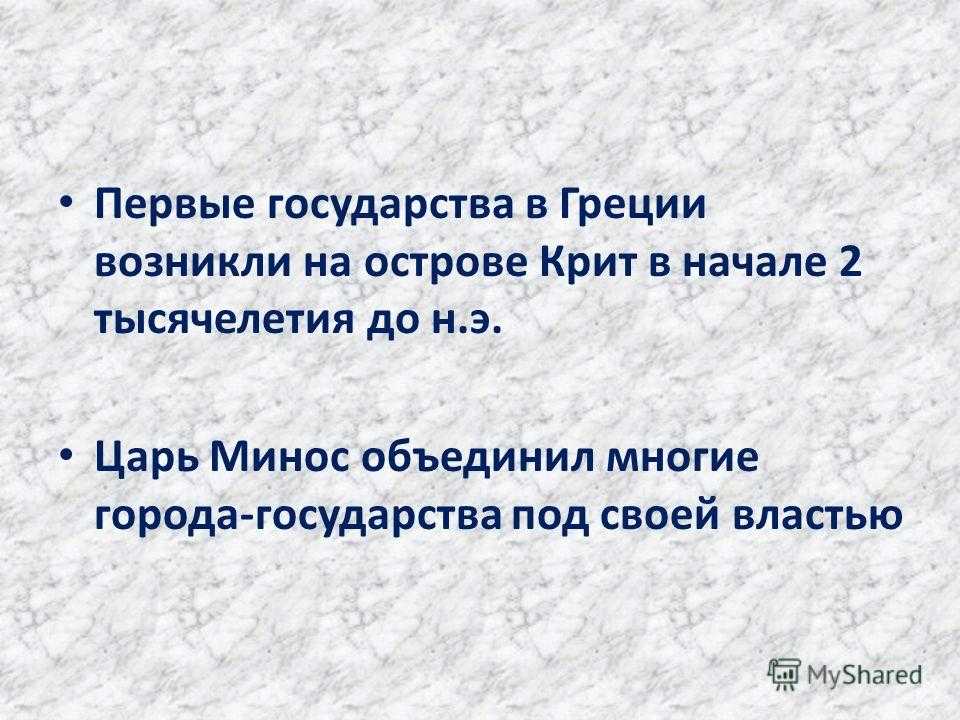 Первые государства в Греции возникли на острове Крит в начале 2 тысячелетия до н.э. Царь Минос объединил многие города-государства под своей властью