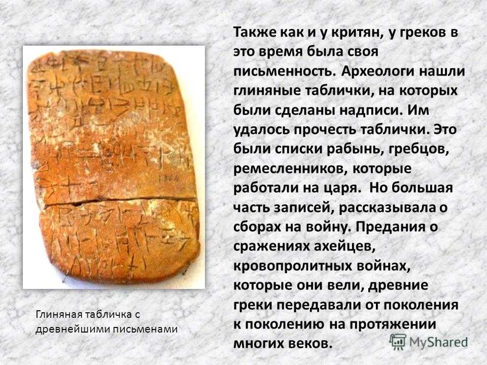 Глиняная табличка с древнейшими письменами Также как и у критян, у греков в это время была своя письменность. Археологи нашли глиняные таблички, на которых были сделаны надписи. Им удалось прочесть таблички. Это были списки рабынь, гребцов, ремесленников, которые работали на царя. Но большая часть записей, рассказывала о сборах на войну. Предания о сражениях ахейцев, кровопролитных войнах, которые они вели, древние греки передавали от поколения к поколению на протяжении многих веков.