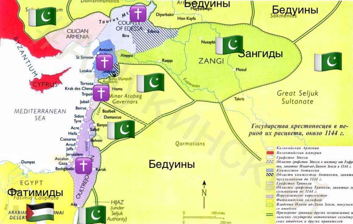 Оттяпанная крестоносцами полоса средиземноморского побережья Сирии окружена сельджукскими халифатами, чьи атабеки (цари) лишь формальные вассалы Великой империи Сельджуков.