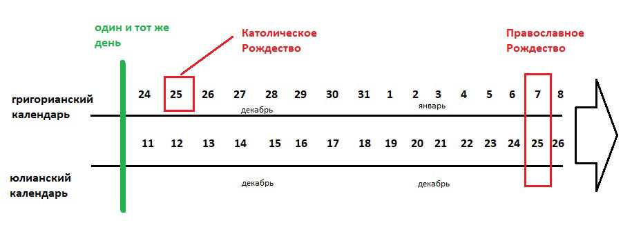 Католики же тоже отмечают Рождество 25-го декабря, но по григорианскому календарю, поэтому у них оно наступает на 14 дней раньше. Причем, чем дальше вглубь веков — тем меньше расхождение в датах, в будущем же разница будет увеличиваться (то есть когда-нибудь мы начнем отмечать Рождество 8-го декабря, потом 9-го, но по церковному юлианскому исчислению это будет тот же самый день именуемый «25 декабря»).
