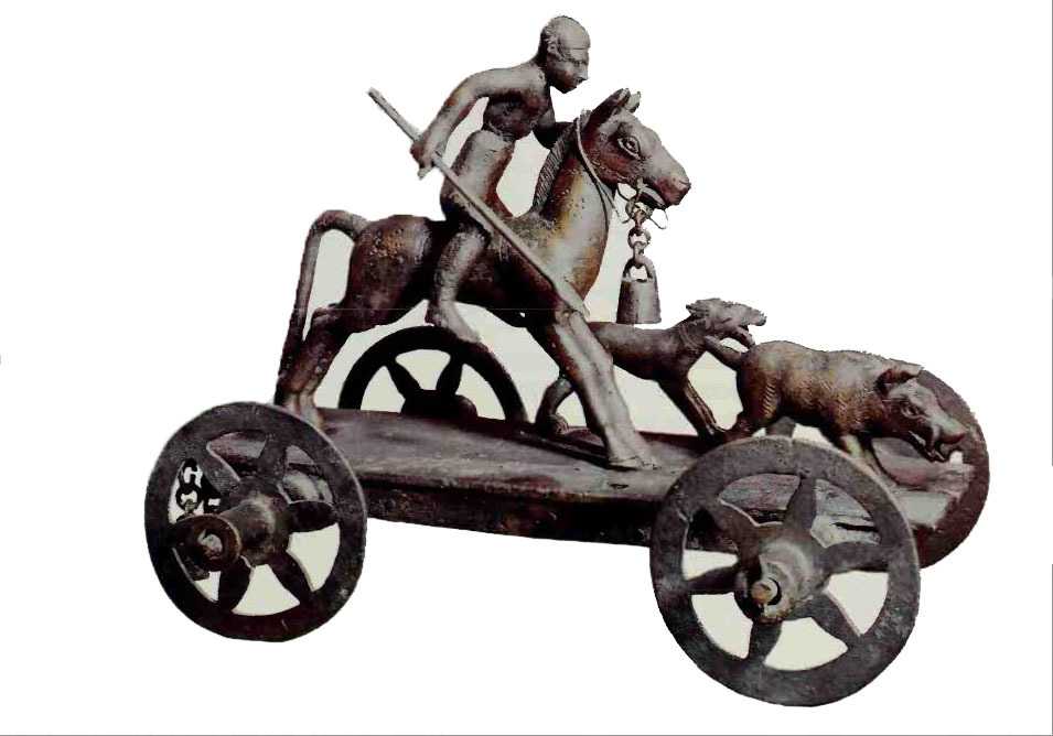 Охотник с копьём в руке и собакой преследует дикого кабана. Кельтская культовая повозка из Мериды, II–I века до н. э.