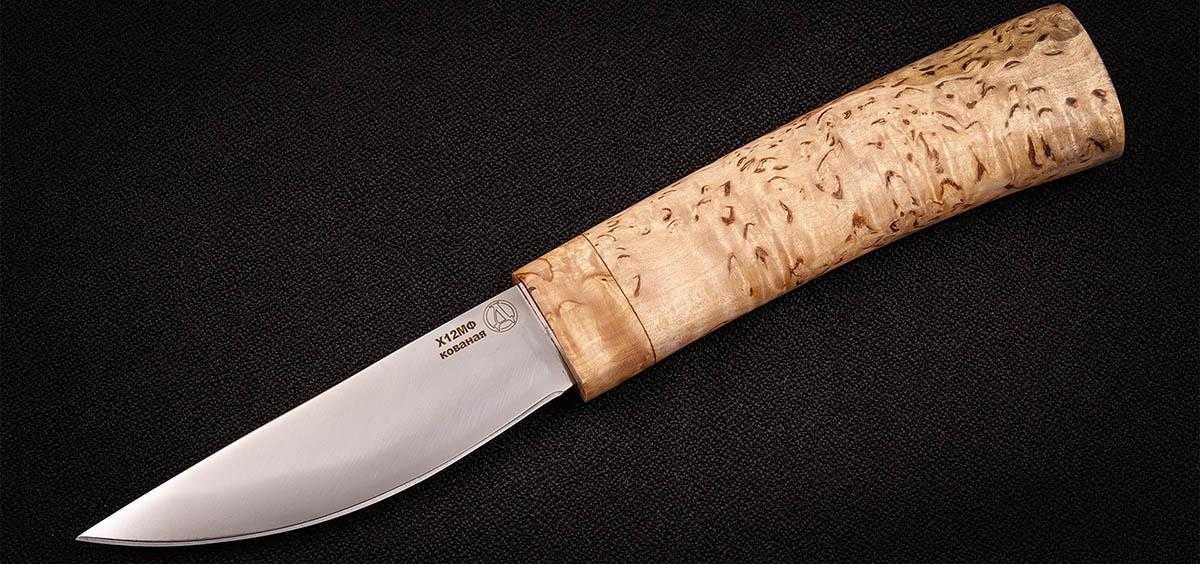 Что касается рукояти, то её делали из берёзового капа (аномальное разрастание древесных волокон), пропитывая специальным маслом. Длина – до 150 мм, что чуть длиннее ширины мужской ладони, поэтому нож в ней вполне удобно лежит. Каких-либо упоров нет. Иногда рукоятку ещё берестой обматывали и проклеивали. А всякие “моржовые клыки” и “бвини мамонтов” – исключительно для большего выпендрёжа используют.