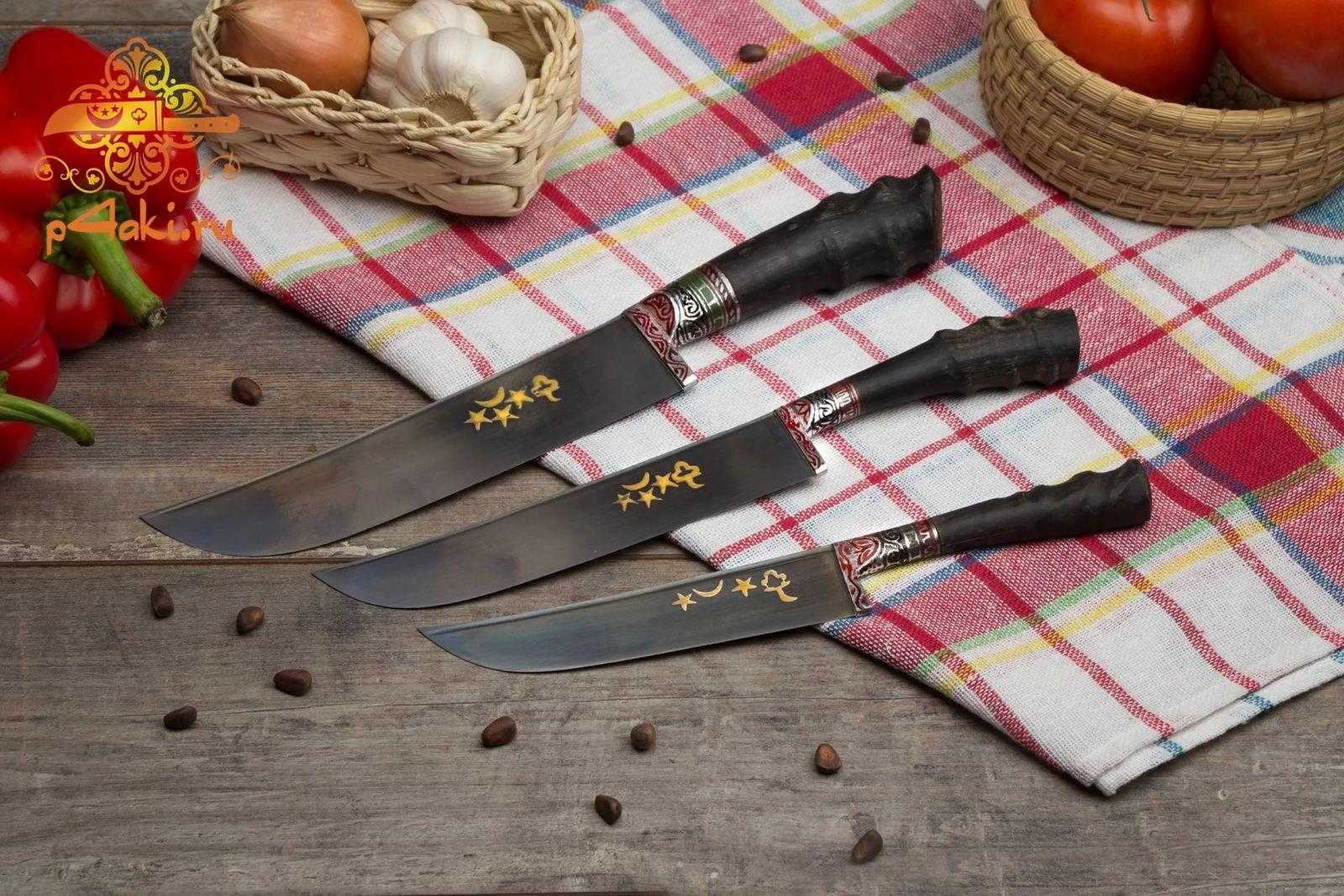 Материалом рукоятей могут быть рога животных (тура, архара, сайгака), кость жирафа, бивень мамонта, эбонит, дерево ценных пород (карельская береза, граб, абрикос, чинара), серебро, мельхиор. Как вставки в материал рукояти применяются бирюза, перламутр, олово. Иногда в украшении используется гравировка золотом или серебром, эмалевая роспись.