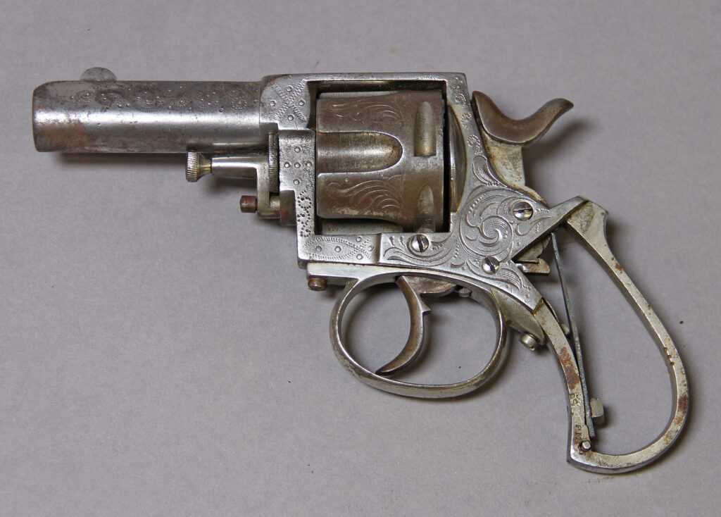 Ещё одной важной особенностью и отличительной чертой ве-лодога был складной спусковой крючок, поэтому скоба вокруг него отсутствовала. Он мог свободно откидывался в сторону ствола и совсем не мешал извлекать револьвер из кармана. Длина спускового крючка была больше, чем у других револьверов, то есть это был «хороший рычаг», способный без особого усилия и курок в момент выстрела взвести, и барабан провернуть, что для такого оружия, действующего на близком расстоянии, было очень важно