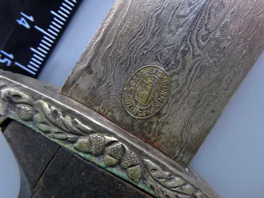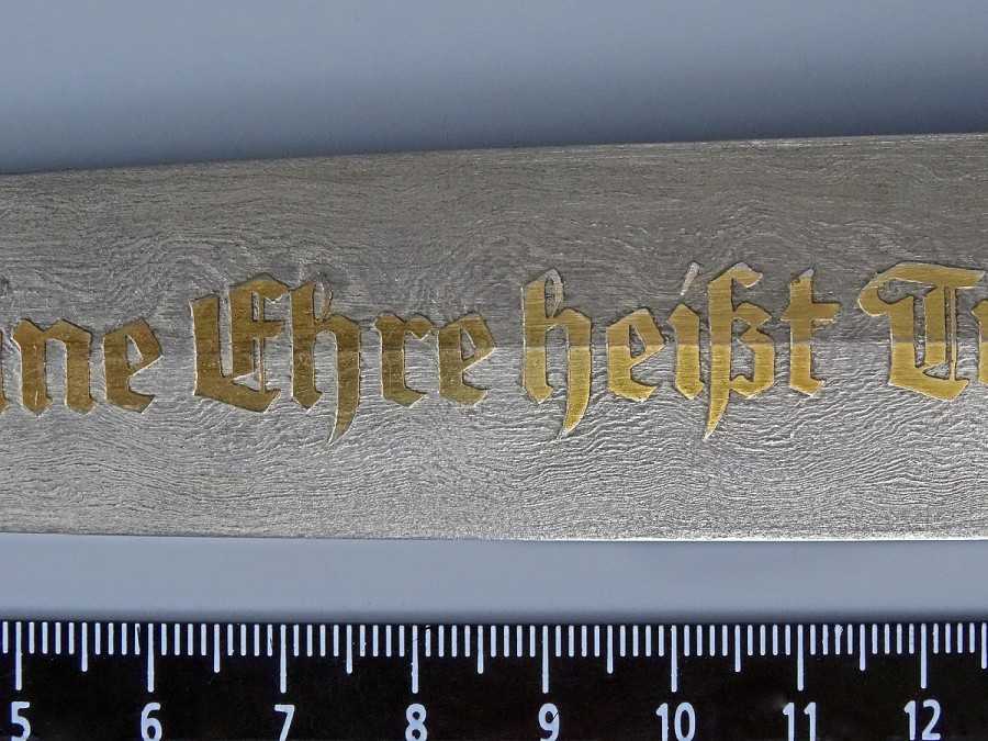 Лицевая сторона обоюдоострого клинка кинжала офицера СС содержала выгравированную или вытравленную надпись «Meine Ehre heißt Treue» (Моя честь – верность). На лезвии кинжала SA тоже была гравировка или травление в виде лозунга «Alles fur Deitschland» (Все для Германии). Оборотная сторона содержала дату выпуска и клеймо производителей кинжалов СС и СА.
