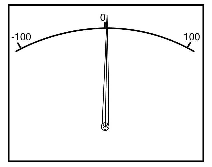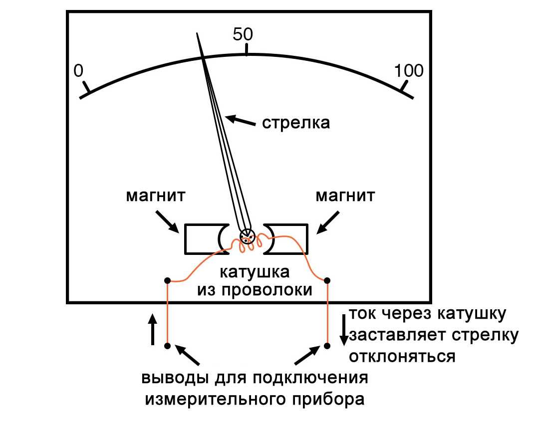 На изображении выше «стрелка» измерительного механизма показана в положении примерно на 35% от полной шкалы, при этом ноль находится на левой стороне дуги, а полная шкала – в крайней правой точке дуги. Увеличение измеряемого тока приведет к тому, что стрелка будет указывать дальше вправо, а уменьшение приведет к тому, что стрелка опустится обратно к своей точке покоя слева. Дуга на дисплее измерительного прибора помечена числами, чтобы указывать значение измеряемой величины, какой бы она ни была.