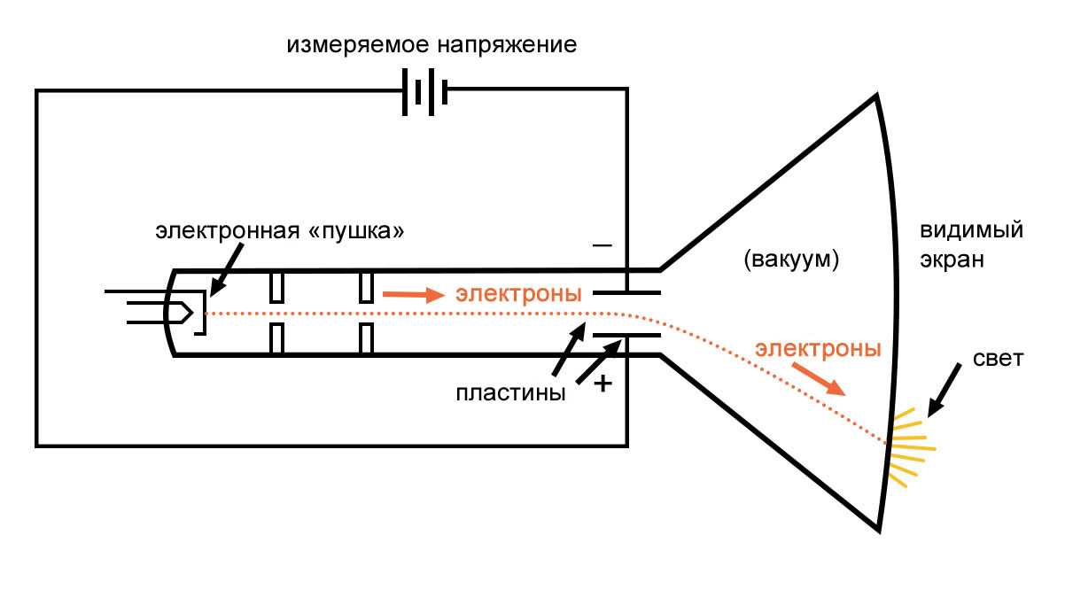 Электроны, имеющие гораздо меньшую массу, чем металлические пластины, под действием электростатической силы очень быстро и легко перемещаются. Их отклоненный путь можно проследить, когда электроны сталкиваются со стеклянным концом трубки, где они сталкиваются с покрытием из фосфорсодержащего вещества, испуская свет, видимый снаружи трубки. Чем больше напряжение между отклоняющими пластинами, тем дальше электронный луч будет «отклоняться» от своего прямого пути, и тем дальше от центра на конце трубки будет находиться светящееся пятно.