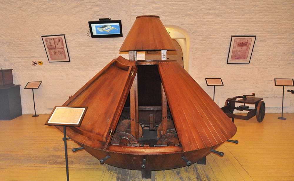 В конце 15 века великому Леонардо да Винчи (см. интересные факты о Леонардо да Винчи) удалось спроектировать танк, выполненный из дерева и металла. По форме он напоминал юлу.