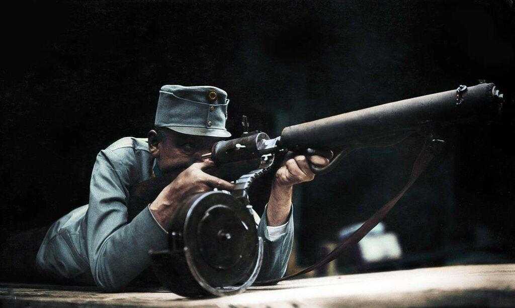 Финский солдат в окопе на Восточном фронте держит в руке «Суоми» с 20-зарядным магазином