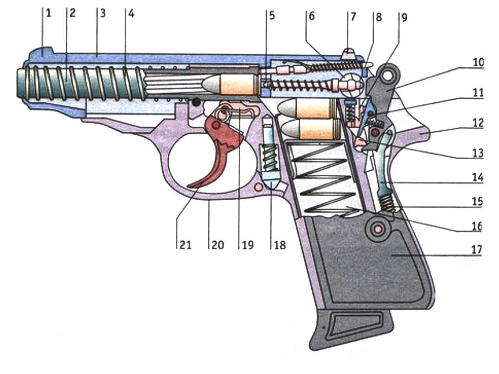 Пистолет Вальтер ПП в разрезе: 1 — мушка; 2 — ствол; 3 — затвор; 4 возвратная пружина; 5 — ударник; 6 — регулируемый предохранитель; 7 — прорезь; 8 —указатель наличия патрона в патроннике; 9 — веский предохранитель; 10 — курок; 11 — предохранитель курка; 12 — рамка; 13 — шептало; 14 — рычаг боевой пружины; 15— боевая пружина; 16 — магазин; 17 — щечка; 18 — фиксатор скобы; 19 — спусковая тяга; 20 — скоба; 21 —спусковой крючок.